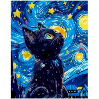 "Kissan yö" maalaus numeroin on kiehtova yhdistelmä eläinaihetta ja klassista maalaustaidetta. Aiheen keskiössä on musta kissa, jonka siluettia koristavat pienet tähdet, katsomassa lumoutuneena yötaivaalle. Taivas on toteutettu Van Goghin tunnistettavalla tyylillä: kirkkaankeltaisia tähtiä ympäröivät dynaamiset siniset pyörteet, jotka luovat vaikutelman maailmankaikkeuden ikuisesta liikkeestä. Tämä teos antaa sinulle mahdollisuuden luoda upeaa sisustusta ja samalla kokeilla suuren mestarin tekniikkaa.