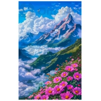 "Korkeuden energia" maalaus numeroin on henkeäsalpaava yhdistelmä vuorten voimaa ja luonnon herkkyyttä. Etualalla leviää kirkkaan vaaleanpunaisten kukkien matto, kun taas kaukaisuudessa kohoavat lumihuippuiset vuoret lävistäen tiheät valkoiset pilvet. Taivaan täyteläiset sinisen sävyt luovat tunteen loputtomasta tilasta ja puhtaasta vuoristoilmasta. Tämä aihe täyttää kotisi vapauden ja inspiraation tunnelmalla, muuttaen maalausprotsessin todelliseksi nousuksi kauneuden huipuille.