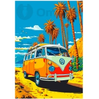 "Retromatka" on eloisa ja nostalginen maalaus numeroin, joka esittää ikonisen oranssin ja valkoisen vintage Volkswagen -retkeilyauton, joka on täydellisesti sijoitettu hiekkatietä pitkin aurinkoisen rannan viereen. Korkeat, tyylitellyt palmut reunustavat maisemaa, kurkottaen kohti kirkkaan sinistä taivasta, jossa on oikukkaita pilviä ja kaukana lentäviä lintuja. Taustalla rauhallinen sininen valtameri ulottuu kohti heikkoja vuoria tai saaria, vihjaten loputtomiin horisontteihin. Tämä maalaus ilmentää vapauden, kesäseikkailujen ja klassisten road tripien ajatonta viehätystä, kutsuen sinut unelmoimaan auringonpaisteisista päivistä ja avoimista teistä.