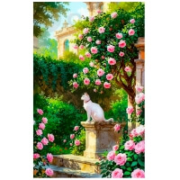 "Salainen puutarhanurkka" maalaus numeroin kutsuu sinut kesäisen auringon täyttämän vanhan puiston tunnelmaan. Aiheen keskiössä on siro valkoinen kissa punaisessa pannassa, joka istuu majesteettisesti klassisella jalustalla. Sen ympärillä kukkivat runsaat vaaleanpunaiset ruusupensaat, ja taustalla näkyy klassisen kartanon tyylikäs arkkitehtuuri. Tämä teos on täynnä valoa ja lämpöä; se on upea lahja estetiikan ja kissojen ystäville, tuoden sisustukseen rauhaa ja ylellisyyttä.