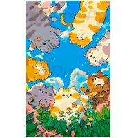 "Uteliaat kasvot" maalaus numeroin on todellinen piristysruisku ja hyvän mielen tuoja. Epätavallinen sammakkoperspektiivi luo tunteen, että joukko hurmaavia pulleita kissanpentuja on piirittänyt sinut ja kurkistaa uteliaana suoraan kuvan keskelle. Kirkkaansininen taivas kevyine pilvineen ja etualan herkät kukat korostavat aiheen keveyttä ja iloisuutta. Tämä nykyaikainen sarjakuvatyylinen kuvitus sopii täydellisesti lastenhuoneen sisustukseen tai tuomaan väriä mihin tahansa huoneeseen.