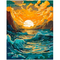 "Valtameren energia" on dynaaminen ja eloisa maalaus numeroin, joka vangitsee valtameren raa'an voiman auringonlaskun aikaan. Kirkas, suuri aurinko hallitsee horisonttia, heittäen voimakkaan oranssin ja keltaisen hehkun tyyliteltyjen, lämpimän sävyisten pilvien täyttämälle taivaalle. Alla myrskyisä meri kuohuaa suurilla, vaahtoavilla aalloilla, jotka on kuvattu silmiinpistävissä turkoosin, sinivihreän ja valkoisen sävyissä, välittäen voimakasta liikettä. Kalliot tai maamassat kehystävät kohtauksen molemmin puolin, lisäten syvyyttä. Tämä maalaus herättää kunnioitusta luonnon suuruutta ja kesyttämätöntä kauneutta kohtaan, juhlistaen valon, veden ja taivaan dramaattista vuorovaikutusta auringonlaskussa.