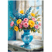 "Tylus ryto grožis" – tai elegantiškas paveikslas pagal skaičius, perteikiantis ramios ryto valandos ramybę ir harmoniją. Kompozicijos centre – vešli puokštė, sudaryta iš švelnių geltonų ir rožinių rožių, taip pat ryškiai mėlynų ir baltų gėlių, grakščiai sudėtų į dekoratyvinę mėlyną vazą. Vaza stovi ant šviesios palangės prie lango, pro kurį sklinda švelni ryto šviesa, apšviesdama kiekvieną žiedlapį ir kurdama šešėlių žaismą. Šis paveikslas kupinas gaivos ir ramybės jausmo, įnešdamas į interjerą klasikinės elegancijos ir švelnaus gamtos grožio atmosferą.
