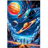 "Už Žemės ribų" – tai užburiantis paveikslas pagal skaičius, nukelsiantis jus į neįtikėtinos kosminės odisėjos širdį. Drobėje pavaizduotas stulbinantis ateivių kraštovaizdis, kuriame trys astronautai stovi ant uolėto paviršiaus, žvelgdami į beribę visatą. Dangus užpildytas daugybe ryškių planetų su žiedais, paslaptingais ūkais ir spindinčiomis žvaigždėmis, nutapytomis sodriais mėlynos, violetinės, oranžinės ir geltonos spalvų atspalviais. Šis paveikslas įkvėps svajones apie tolimas galaktikas ir neatrastus pasaulius, todėl tai puiki dovana visiems astronomijos entuziastams, mokslinės fantastikos mėgėjams ir nuotykių ieškotojams.