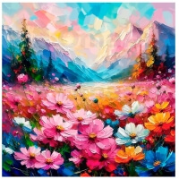 "Kalnu puķu ieleja" ir krāsu un iedvesmas sprādziens vienā gleznā. Audekls attēlo bezgalīgu spilgti rozā, dzeltenu un baltu ziedu lauku, kas plešas majestātisko kalnu pakājē. Īpaša tehniku, kas imitē platus triepienus, piešķir ainavai apjomu un neticamu dinamiku, it kā jūs justu svaigu kalnu vēju. Šis darbs ir ideāli piemērots tiem, kuri vēlas atdzīvināt interjeru ar sulīgiem toņiem un izbaudīt mūsdienu ekspresīvās glezniecības radīšanas procesu.