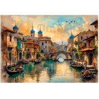 Картина по номерам «Золотой час на канале» переносит вас на уютные улочки старинного города на воде. В центре сюжета — тихий канал с припаркованными гондолами, над которыми возвышаются величественные здания с ярко-синими куполами. Теплые лучи заходящего солнца окрашивают небо и воду в золотистые тона, создавая атмосферу покоя и романтики. Прорисовывая каждую деталь — от бликов на воде до птиц в небе — вы почувствуете себя настоящим художником, запечатлевшим мгновение красоты.